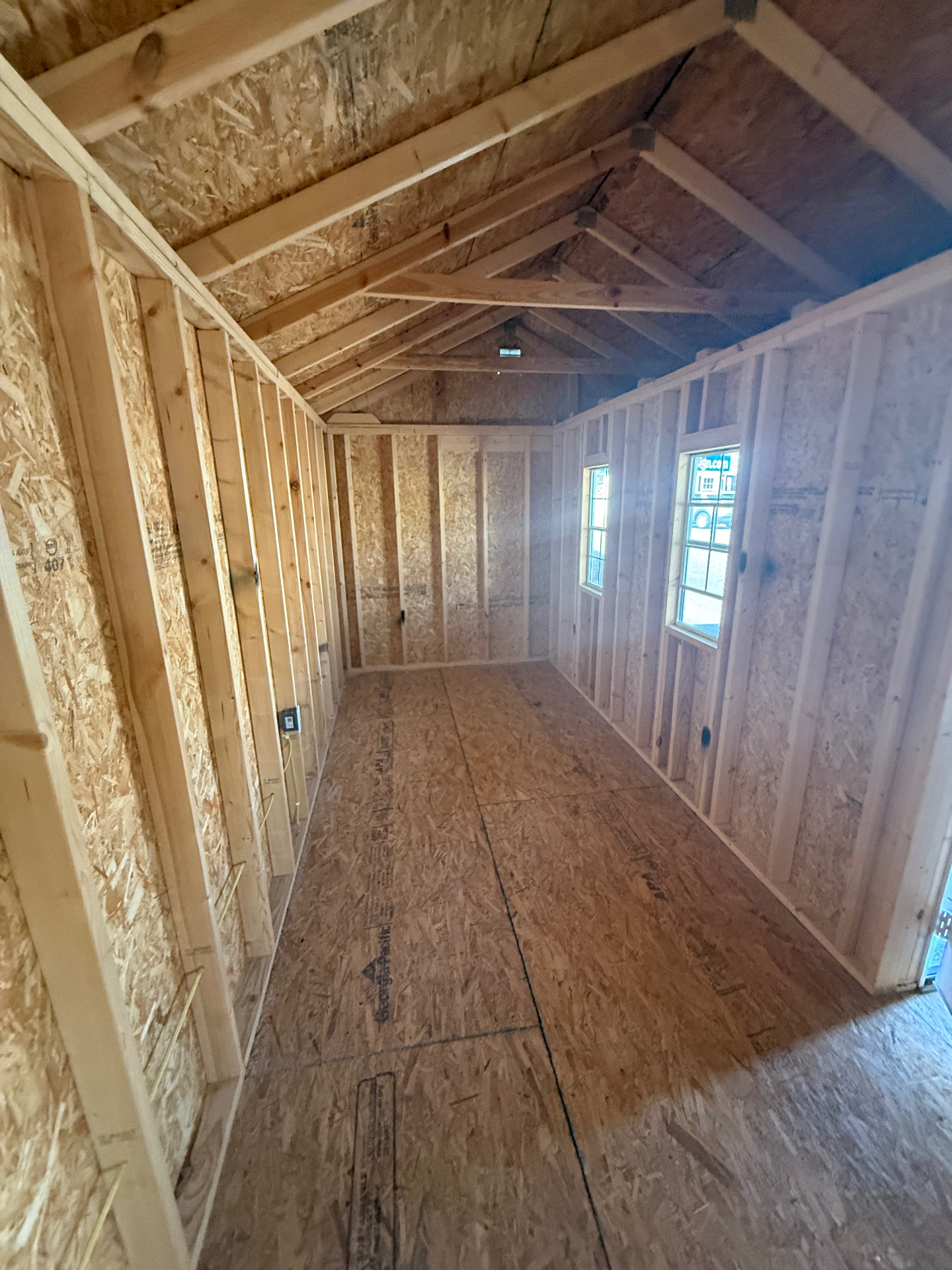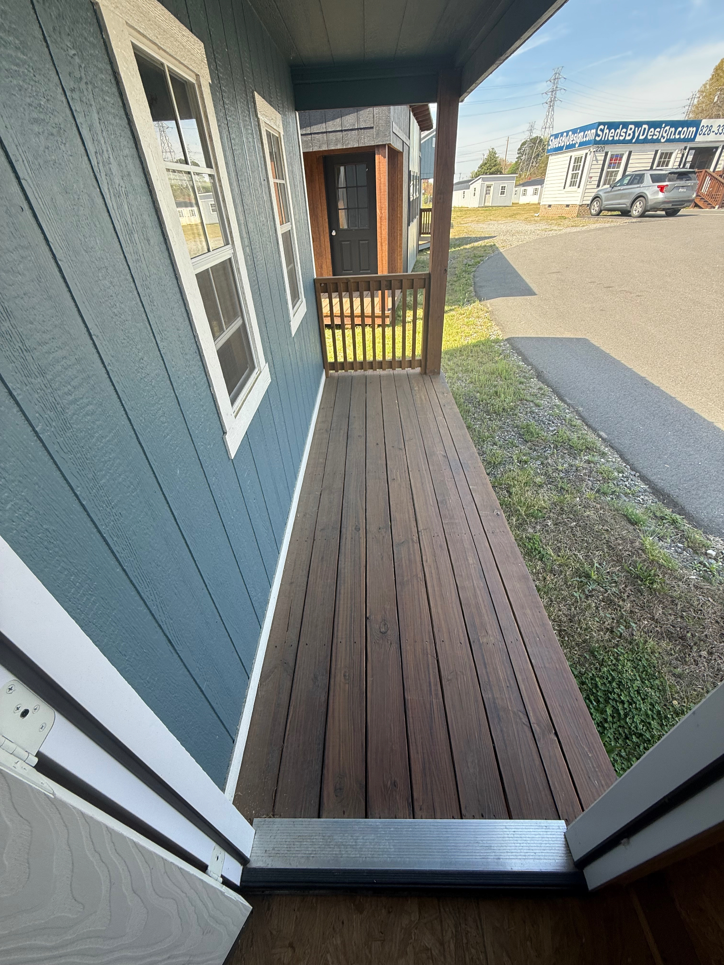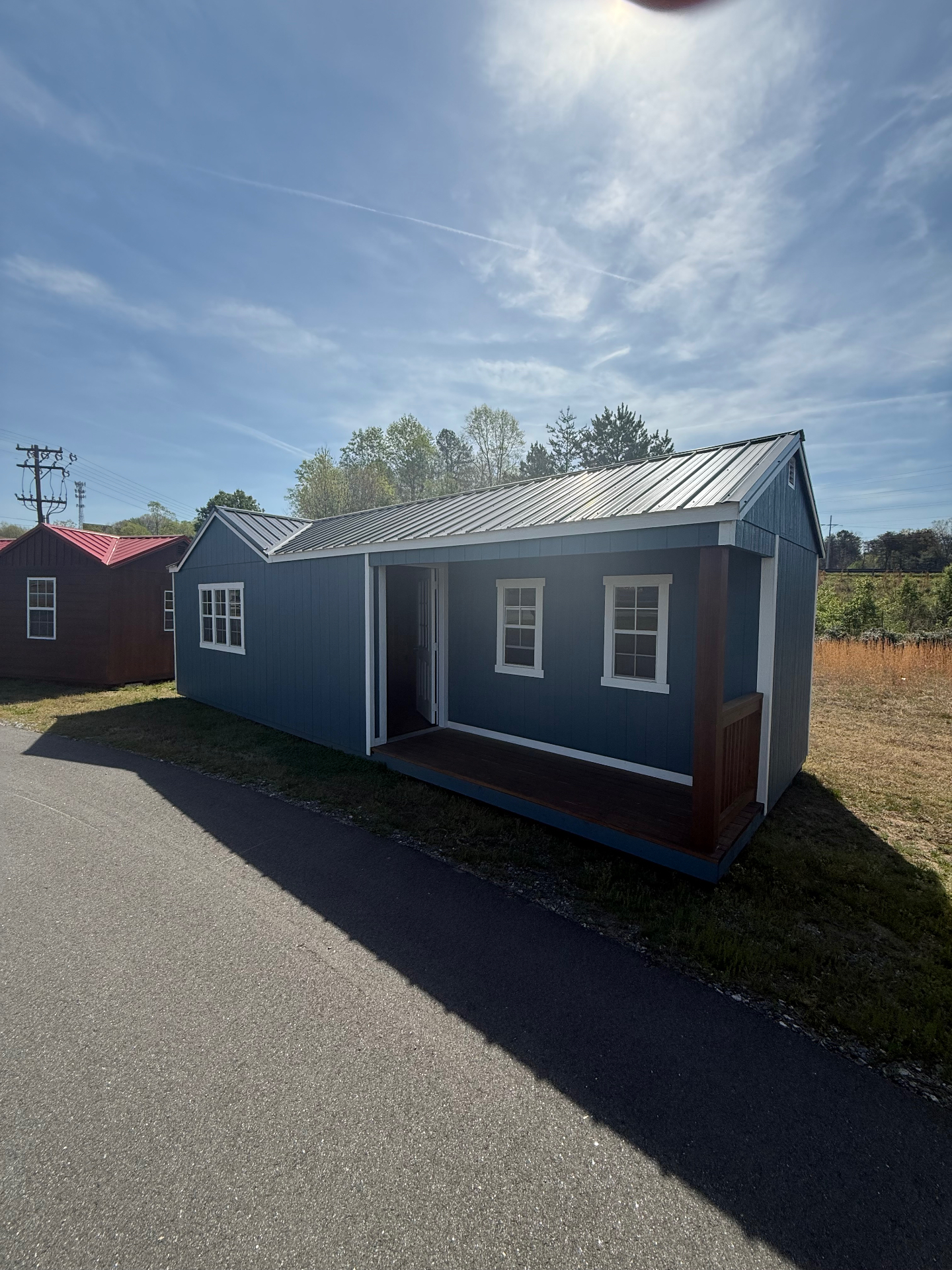 Massive 12×32 A-Frame Corner Cabin with covered porch, perfect for a backyard office, she-shed, man cave, or tiny living space. Features a spacious open-concept interior with soaring A-frame ceilings, multiple windows for natural light, a full-size entry door, and a beautiful wraparound covered porch with wood decking. Blue painted exterior with white trim and metal roof. Built tough and ready for delivery in the Charlotte area.