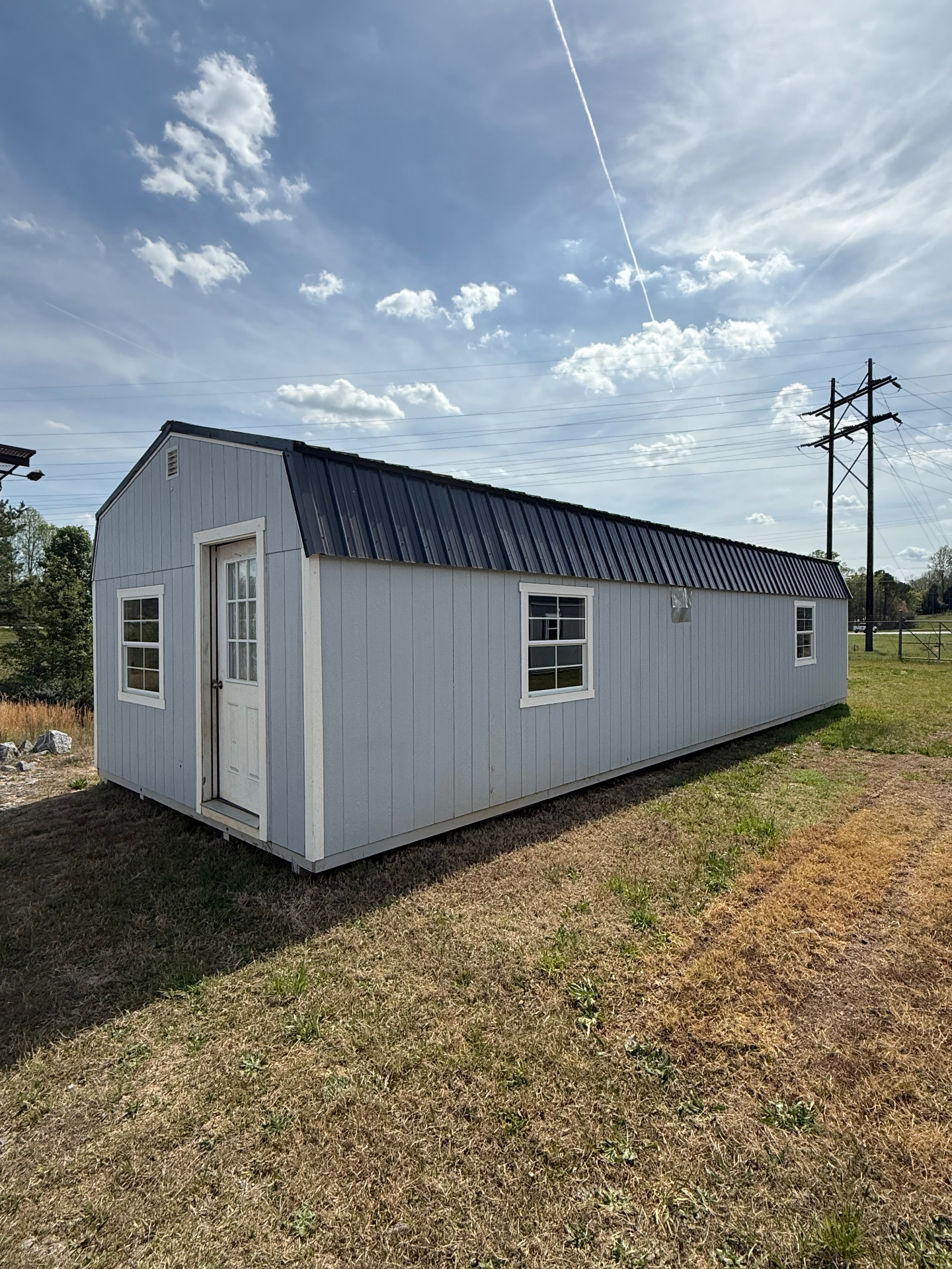 Massive space at a massive discount — this 14×40 Barn Shed Repo is one of the largest pre-owned buildings we’ve ever offered near Charlotte, NC. With a jaw-dropping 560 square feet of open floor space, this barn-style shed is perfect for a full-size workshop, oversized garage, equipment storage, or even a she-shed/man-cave conversion. The classic gambrel roofline delivers exceptional headroom and usable loft space, while multiple windows flood the interior with natural light. Built tough with durable LP SmartSide siding, a sleek charcoal metal roof, and a residential-style entry door. Electrical rough-in is already in place for easy finishing. Note: 14′ wide buildings require oversize hauling — delivery/transport fees are additional. Call for a hauling quote to your location.