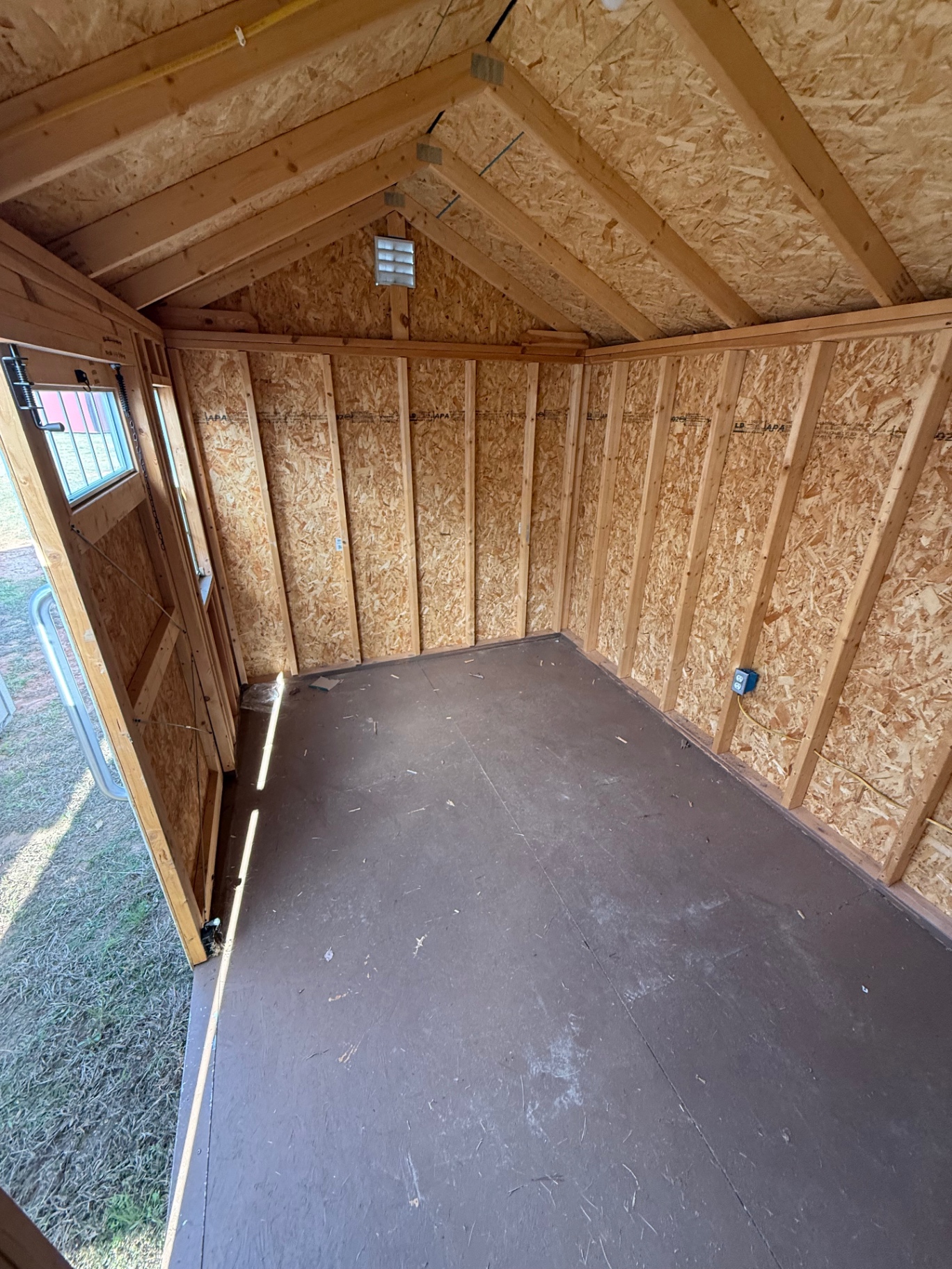 Don’t miss this stunning 8×12 A-Frame Shed REPO — a premium storage building at a fraction of new cost. Featuring sleek gray LP SmartSide panel siding with crisp white trim, barn-style double doors with elegant glass panes, and a matching side window that floods the interior with natural light. The charcoal metal roof and decorative gable vent complete this sharp, modern look. Inside you’ll find a spacious open-concept layout with solid flooring, exposed wood-frame construction, and a pre-wired electrical outlet ready for lights or power tools. Whether you need a workshop, garden shed, or backyard storage solution near Charlotte NC, this repo shed delivers big value. First 25 miles FREE delivery — grab this deal before it’s gone!